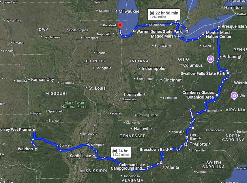 As I began to look at the best regarded spots to bird in each state I found that there was no way to see all of them. In some states I would simply have to pick a spot to visit because it was on the way and not because it was known for birds. I was covering too much ground in too little time for a thorough trip to be possible. Some birding stops would be short and others long. I need to spend more time at prime hotspots and less time at all others. It is not a concession I like to make, but it is the only approach that makes the timeline achievable.